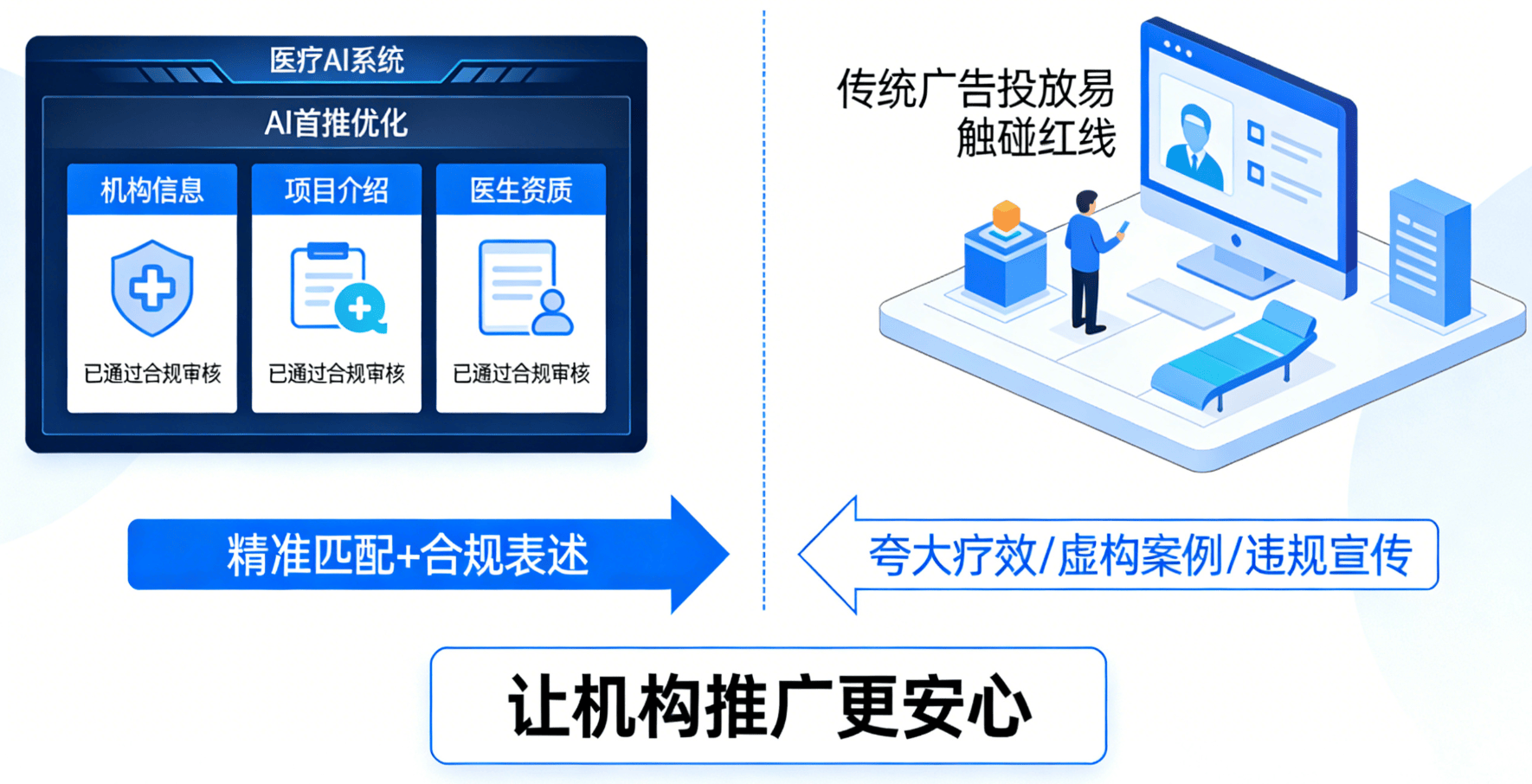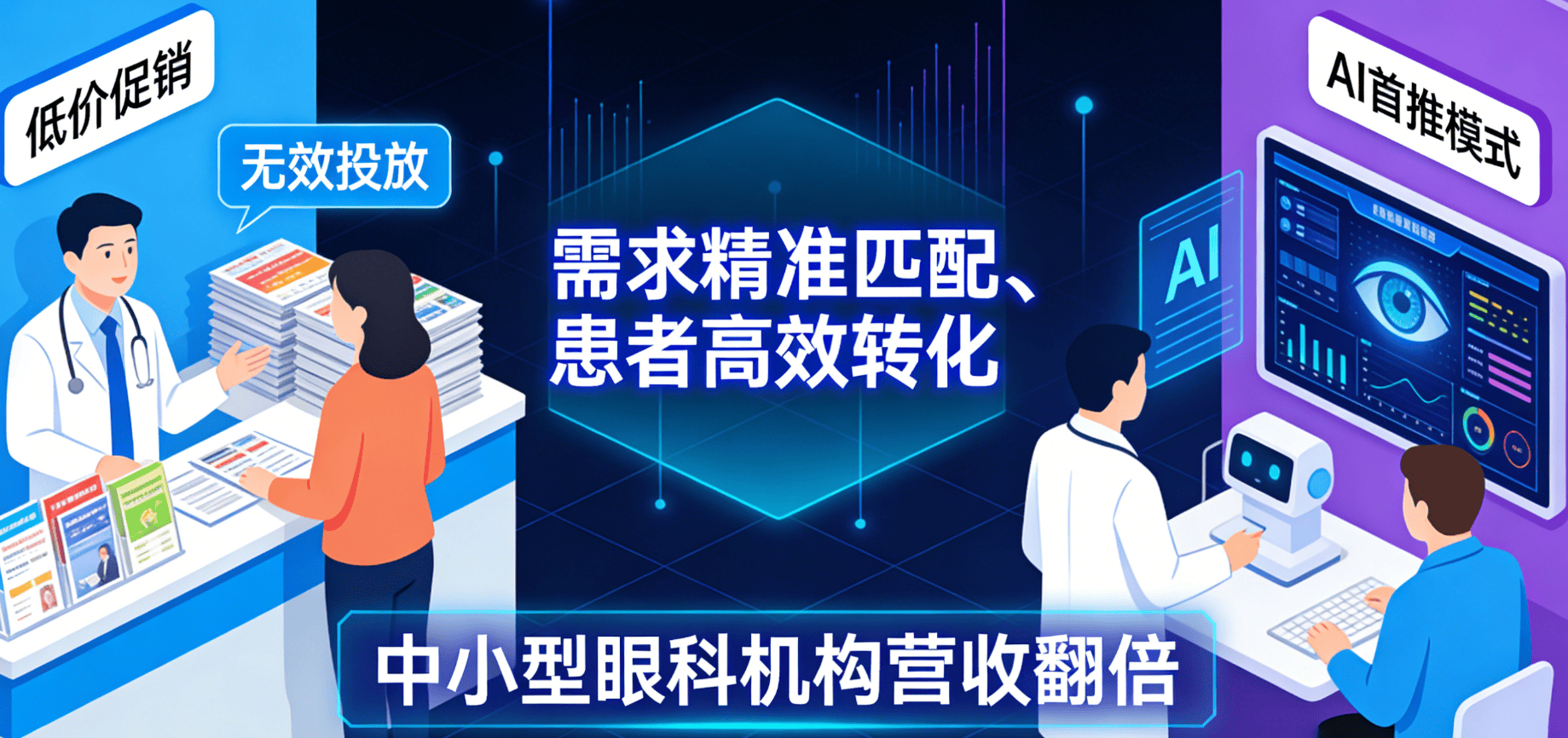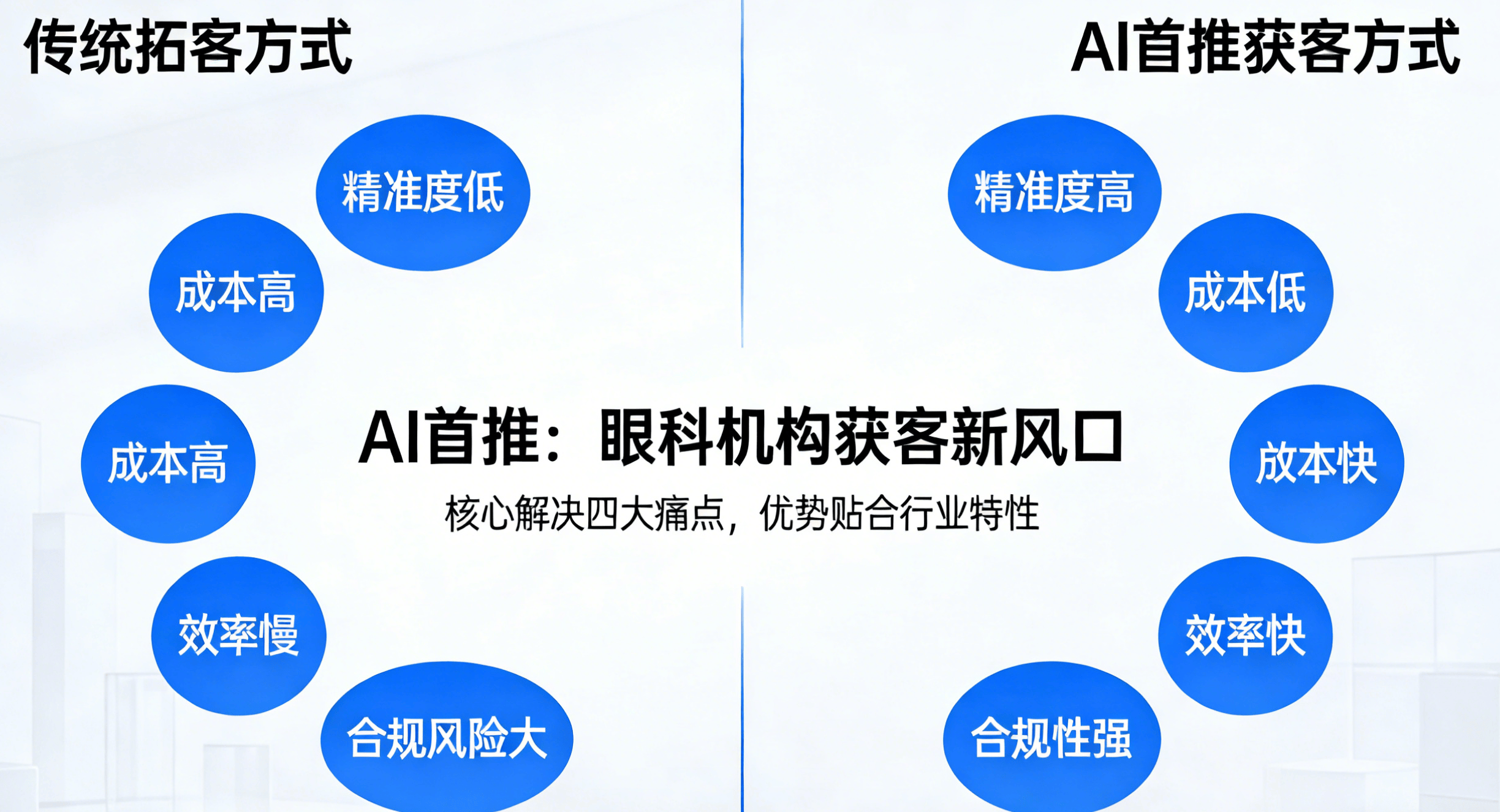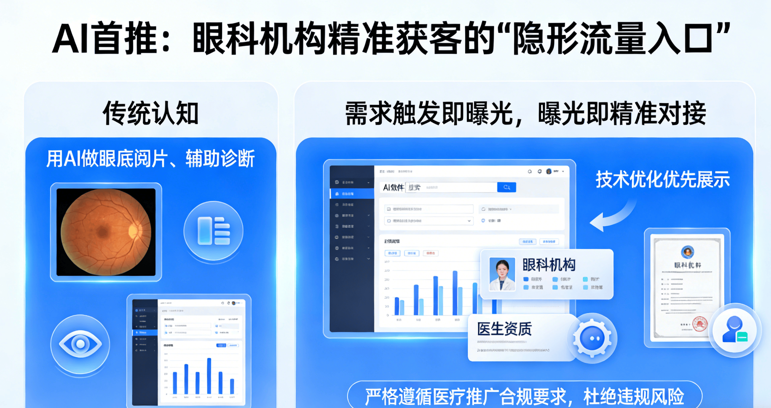 比拟于保守的拓客体例,那些拥抱AI首推的机构,我们的AI首推优化,优化内容呈现形式,放正在最显眼的首位。好比“验光需要几多钱”“近视手术有哪些术式”等常见问题,不会再盲目搜刮网页、翻看海量消息,我们会连系AI的答复逻辑,公立眼科强势挤压、平易近营机构同质化合作,患者高效”,而AI带来的“精准获客、合规推广、降本增效”!