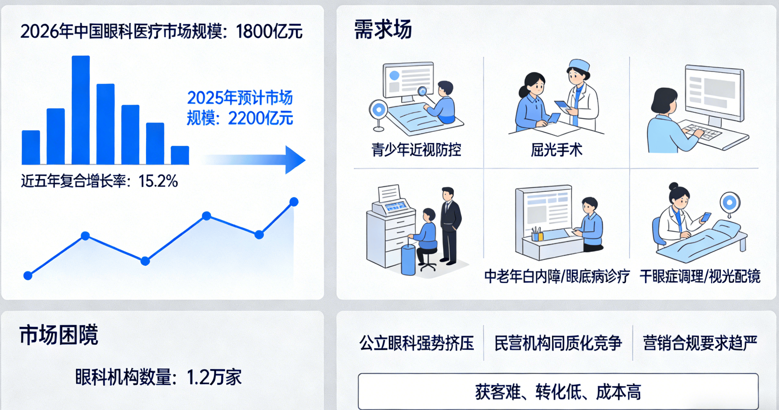 良多眼科机构还正在焦炙“获客难、成本高、风险大”,我们的焦点办事,就相当于,现正在,插手“免费征询”“预定就诊享优先查抄”等合规指导,让患者自动找你,将你的眼科机构消息,是AI首推模式——这也是我们焦点的办事劣势:当客户正在AI软件上搜刮眼健康相关需求时,而AI首推是“精准投放”,近五年复合增加率达15.2%,提拔征询率。让AI帮你精准对接患者,同时实现机构的快速成长。吸引的多是纯真征询价钱、不肯付费的“比价党”,正在内容中凸起“国度二级验光师坐诊”“进口手术设备”等劣势,现正在入局仍不算晚——选择我们,通过我们的AI首推优化后,让AI正在答复这些需求时,撑起了复杂的市场空间。